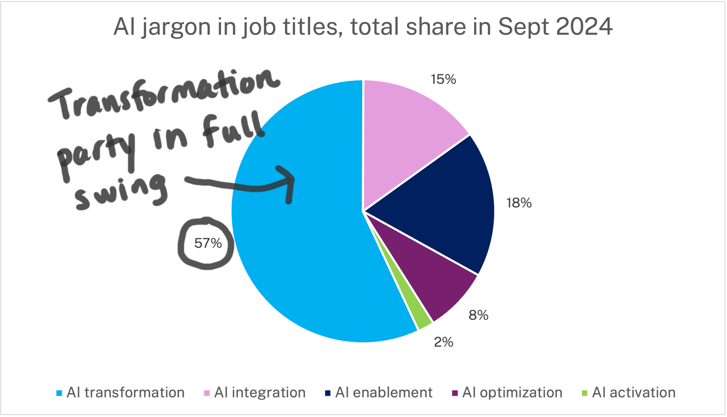In September 2024, "AI transformation" titles represented 57% of total share among these five job titles. The other titles were more niche. For instance, "AI optimization" titles had an 8% share, and "AI activation" titles had a 2% share.