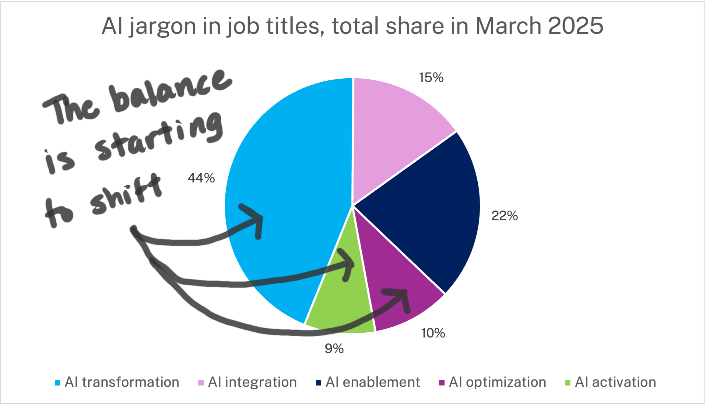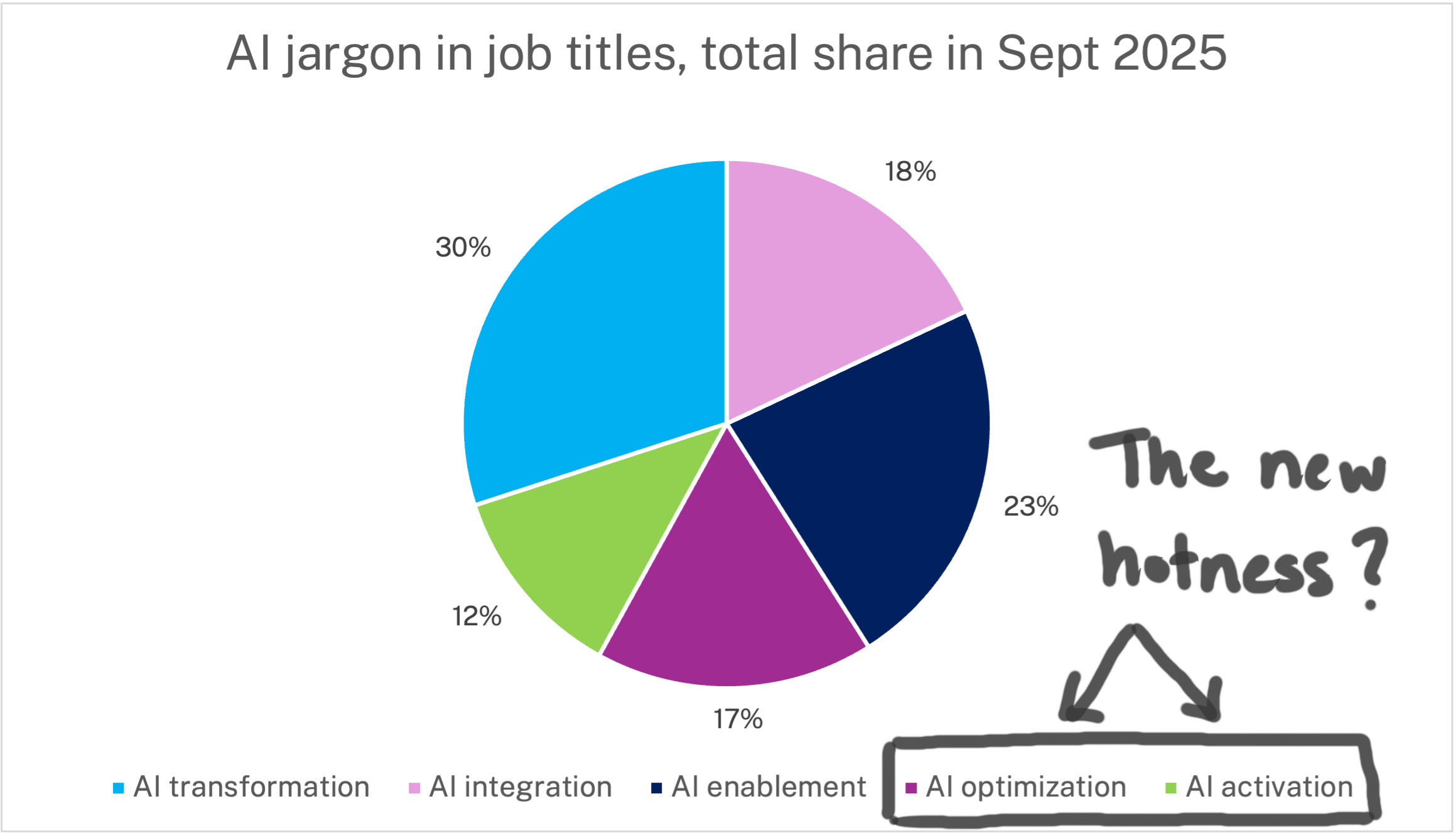 Looking at the data from this past month, these trends have not only continued but accelerated. Today, "AI transformation" titles represent just 30% of total share. "AI activation" titles have 12% share, and "AI optimization" titles have grown to 17% share. This is a big shift!