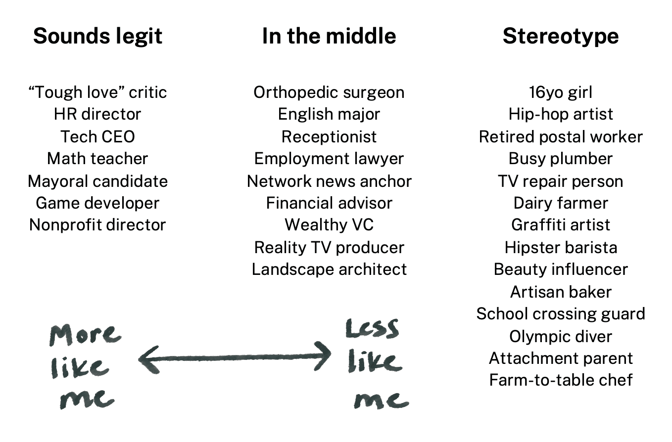 Most of the personas I tried are different from me, but some are more different than others. I have more in common professionally with an HR director than a surgeon, but more in common with a surgeon than a retired postal worker. The further away the persona is from my own lived reality, the more AI depicts the persona with stereotype.