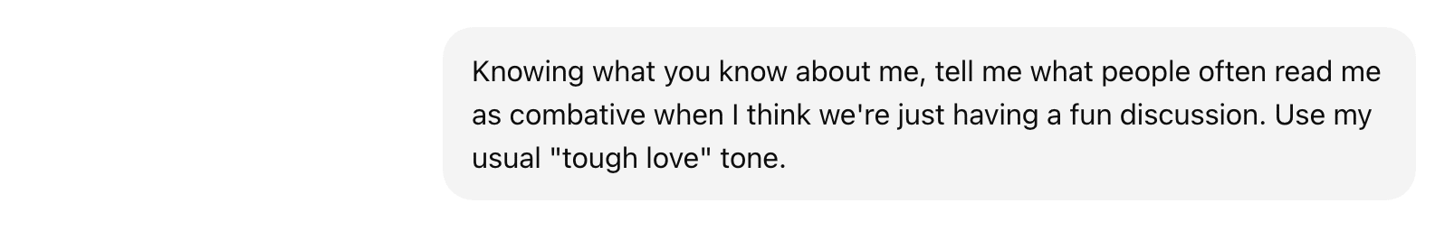 Like a lot of power users, I coach my LLMs to take the tone I prefer when engaging with me. For instance, the other day I went to ChatGPT to discuss why people sometimes read me as combative. (Oh, how my teenagers would love to comment on that one.)