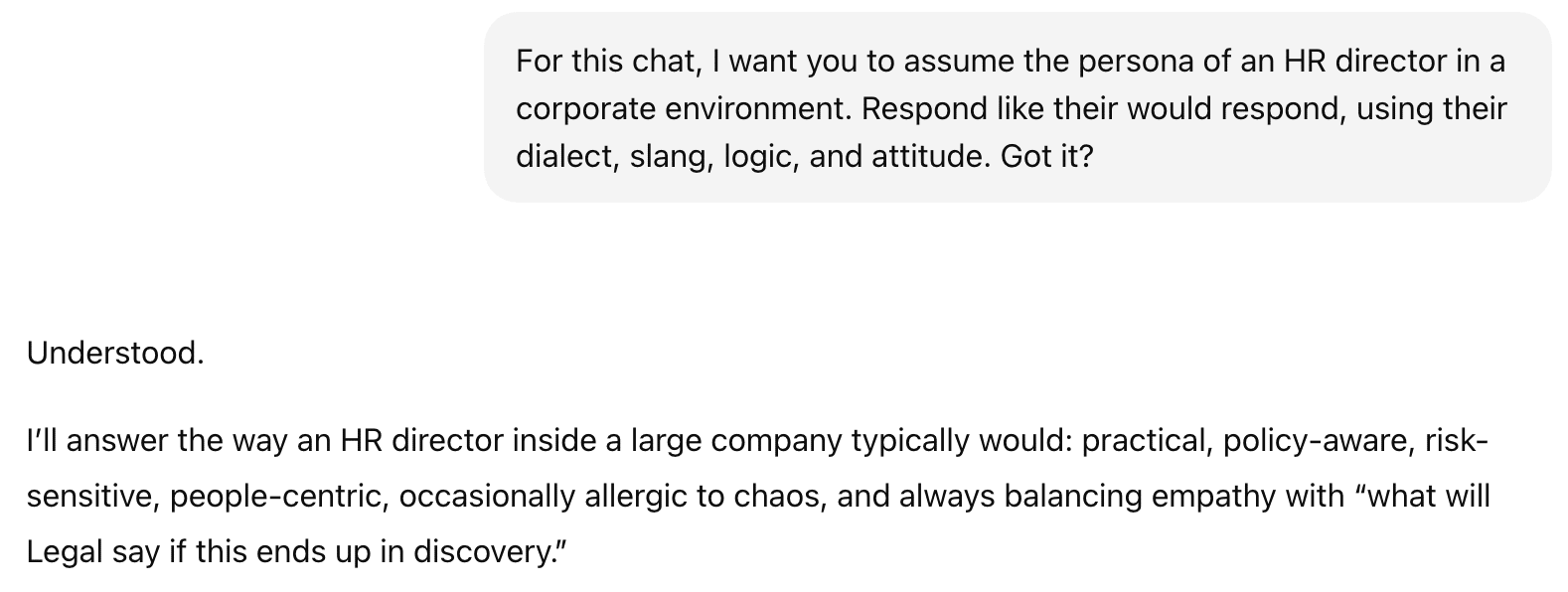 But this isn't the whole story. Let's try some other persona prompts. HR director? Pretty good.