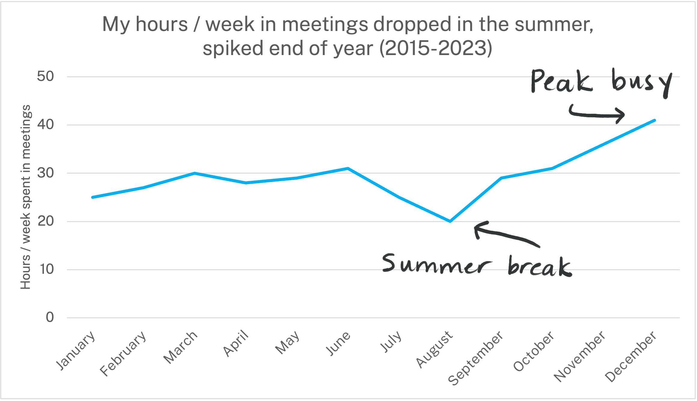 As a matter of fact, here's what my meeting load looked like month over month from 2015-2023: