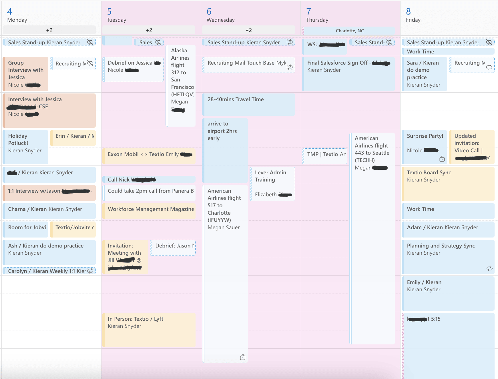 Although the company was officially closed between Christmas and New Year's, we had sales calls and deal standup nearly daily to coordinate deal ops. Every week after Thanksgiving was scheduled wall to wall. For instance, here's a screenshot of my calendar from a typical week in early December: