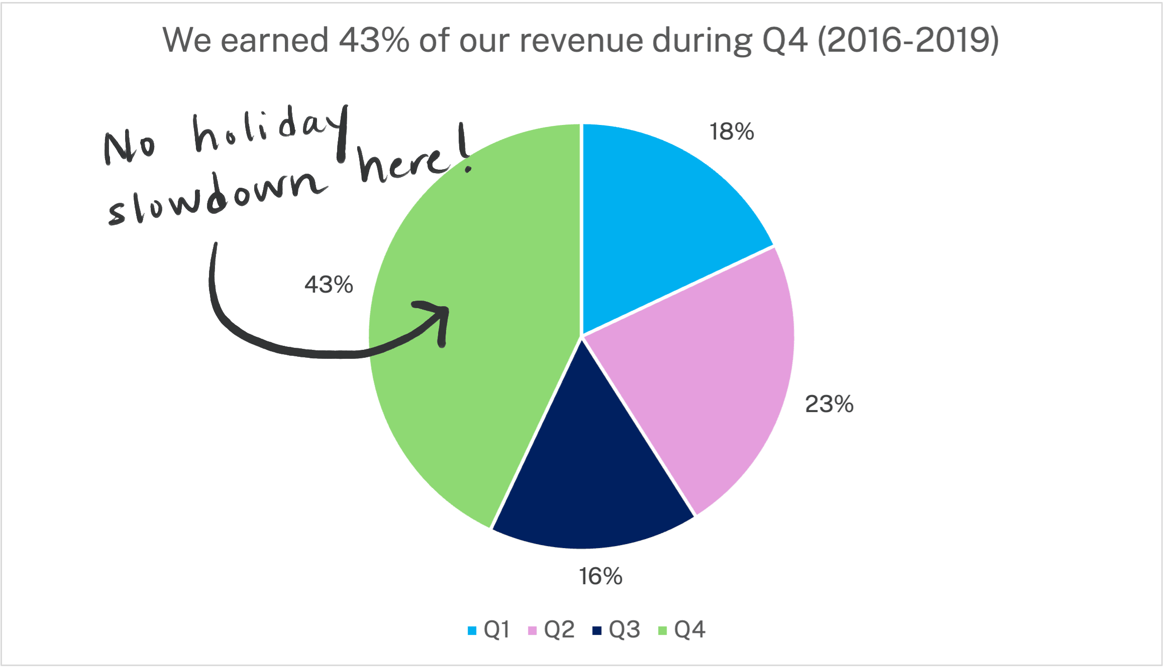 As a result, our revenue was not spread evenly across the year. In fact, as our sales ramped up between 2016-2019, we earned 43% of our annual revenue during Q4. The majority of it was in December.