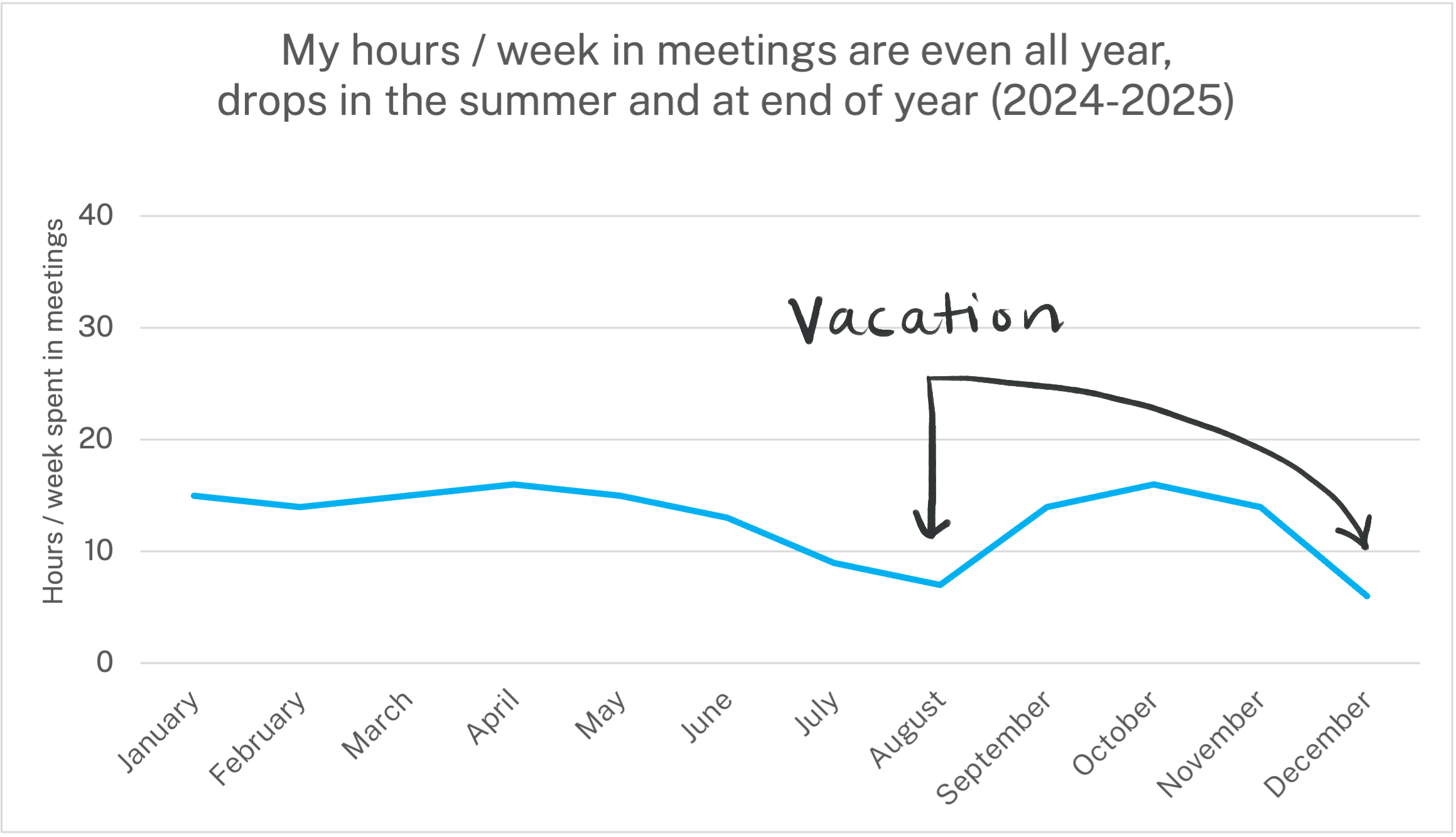 My calendar has looked quite different since I stepped back from being Textio's CEO. I've had more control over my work calendar. This is what my month-over-month meeting load has been like since January 2024 when I stepped down:
